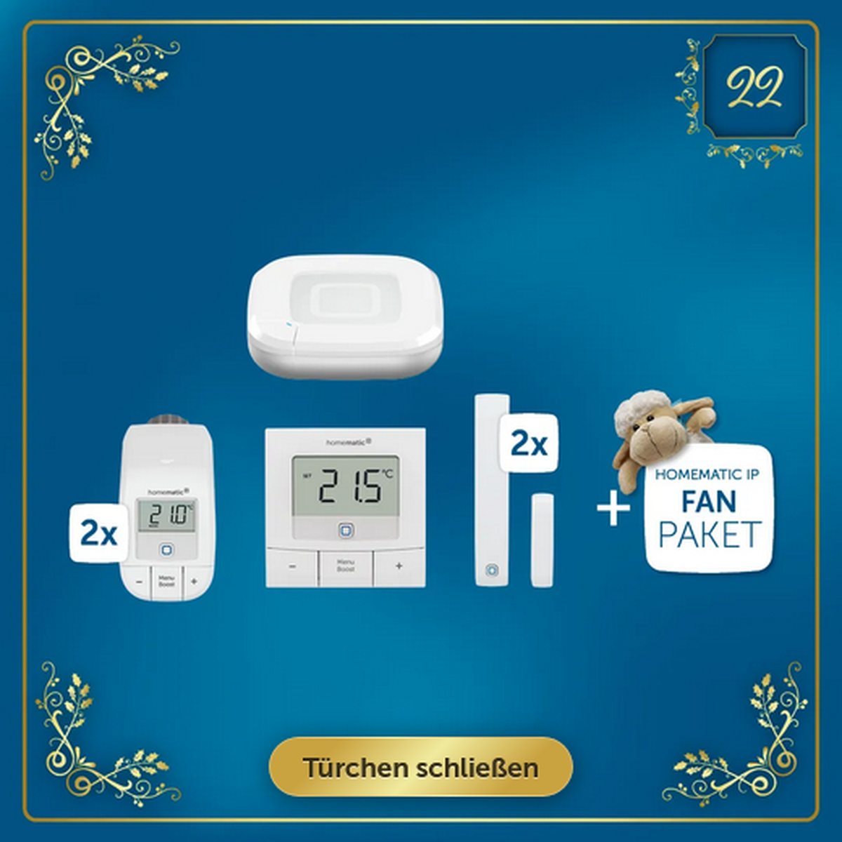 Im heutigen Türchen des Homematic IP Adventskalenders, am 22.12., wird ein Homematic IP Basic-Raumklima-Set verlost, mit dem sich eine intelligente Heizungssteuerung schnell und unkompliziert realisieren lässt. Das Set richtet sich besonders an Nutzer, die ohne großen Aufwand in die smarte Heizungsregelung einsteigen möchten.