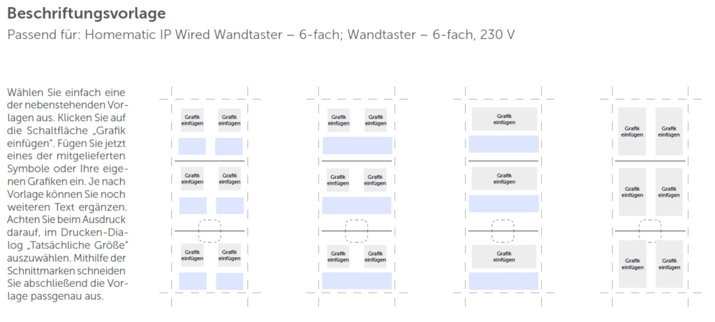 Für eine saubere und einheitliche Beschriftung stellt Homematic IP eine passende Druckschablone zum Download bereit. Diese kann individuell angepasst und ausgedruckt werden, sodass die Tastenbeschriftung exakt auf die jeweilige Konfiguration abgestimmt ist.